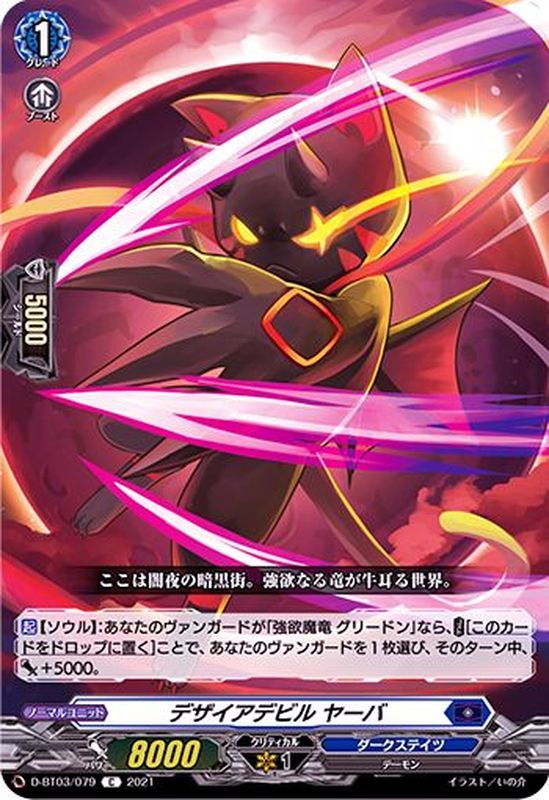 【起】【ソウル】:あなたのヴァンガードが「強欲魔竜 グリードン」なら、【コスト】[このカードをドロップに置く]ことで、あなたのヴァンガードを1枚選び、そのターン中、パワー+5000。