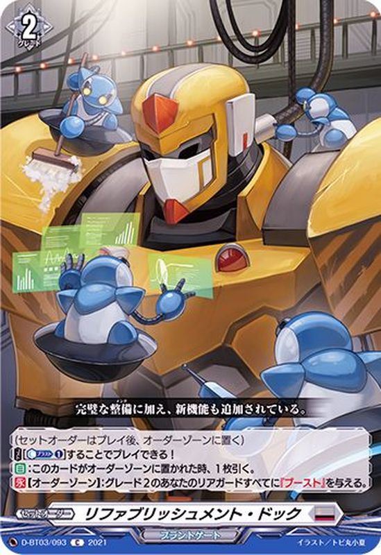 (セットオーダーはプレイ後、オーダーゾーンに置く)【コスト】[【カウンターブラスト】(1)]することでプレイできる!【自】:このカードがオーダーゾーンに置かれた時、1枚引く。【永】【オーダーゾーン】:グレード2のあなたのリアガードすべてに『ブースト』を与える。