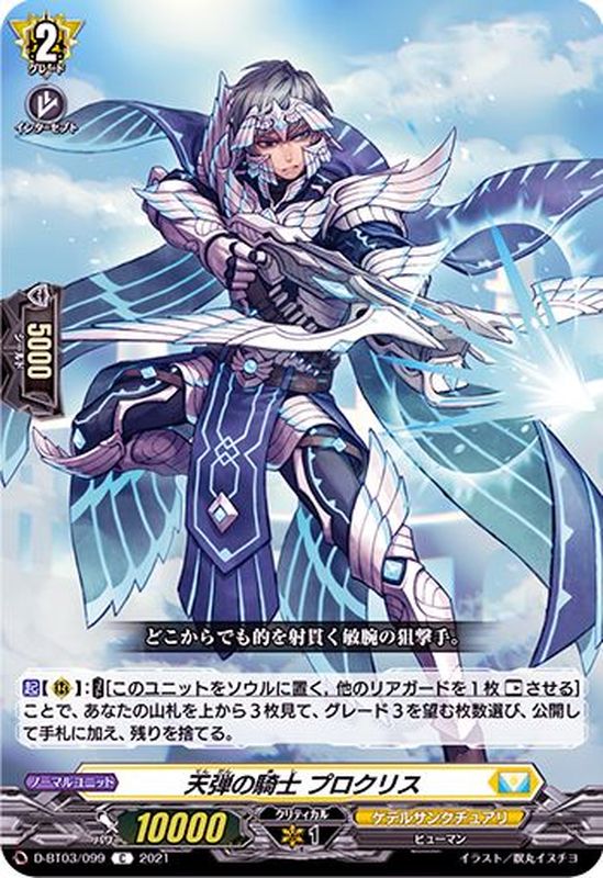 【起】【(R)】:【コスト】[このユニットをソウルに置く,他のリアガードを1枚【レスト】させる]ことで、あなたの山札を上から3枚見て、グレード3を望む枚数選び、公開して手札に加え、残りを捨てる。