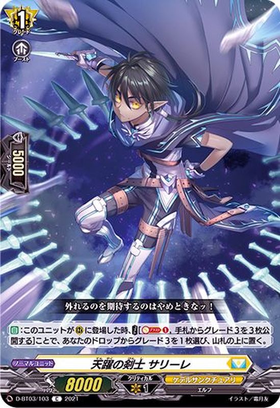 【自】:このユニットが(R)に登場した時、【コスト】[【ソウルブラスト】(1),手札からグレード3を3枚公開する]ことで、あなたのドロップからグレード3を1枚選び、山札の上に置く。