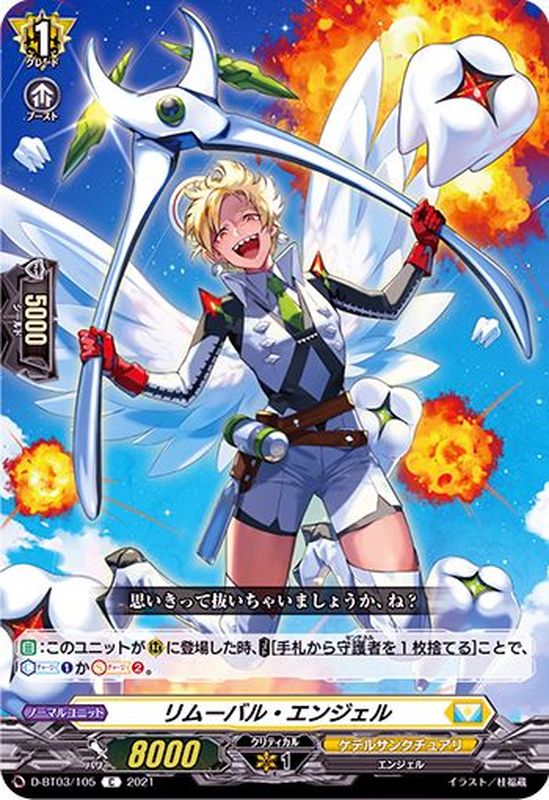 【自】:このユニットが(R)に登場した時、【コスト】[手札から守護者を1枚捨てる]ことで、【カウンターチャージ】(1)か【ソウルチャージ】(2)。