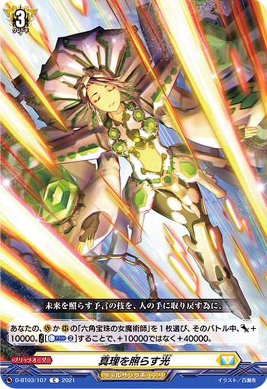 あなたの、(V)か(R)の「六角宝珠の女魔術師」を1枚選び、そのバトル中、パワー+10000。【コスト】[【カウンターブラスト】(2)]することで、+10000ではなく+40000。