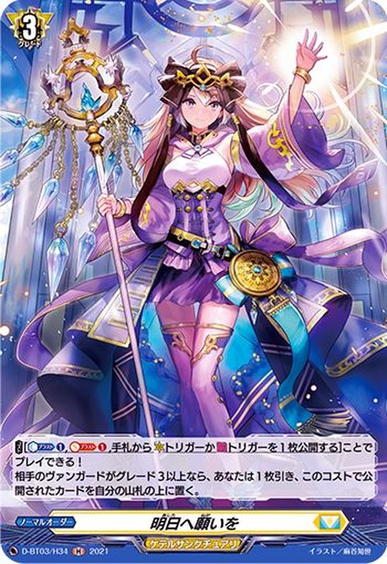 【コスト】[【カウンターブラスト】(1),【ソウルブラスト】(1),手札からクリティカルトリガーか【前】トリガーを1枚公開する]ことでプレイできる!相手のヴァンガードがグレード3以上なら、あなたは1枚引き、このコストで公開されたカードを自分の山札の上に置く。