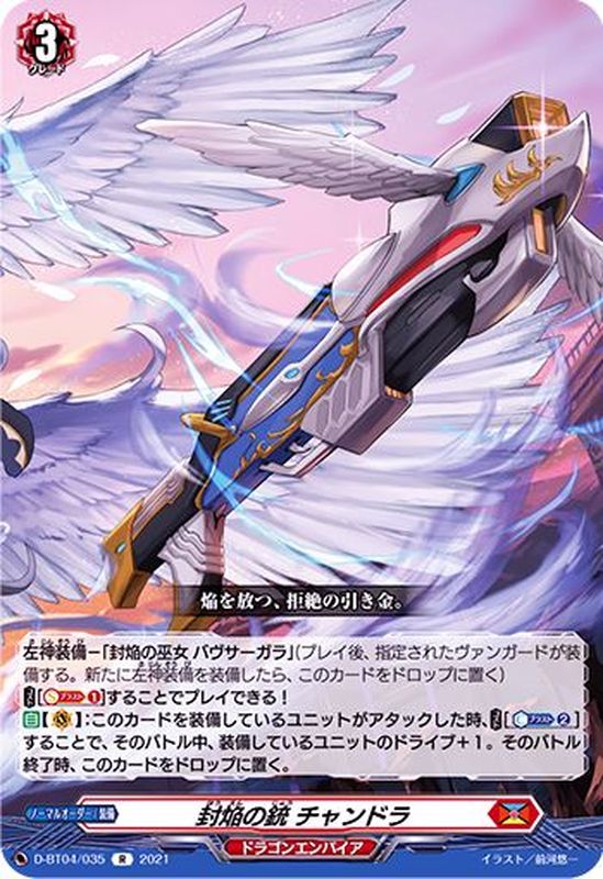左神装備-「封焔の巫女 バヴサーガラ」(プレイ後、指定されたヴァンガードが装備する。新たに左神装備を装備したら、このカードをドロップに置く)【コスト】[【ソウルブラスト】(1)]することでプレイできる!【自】【(V)】:このカードを装備しているユニットがアタックした時、【コスト】[【カウンターブラスト】(2)]することで、そのバトル中、装備しているユニットのドライブ+1。そのバトル終了時、このカードをドロップに置く。