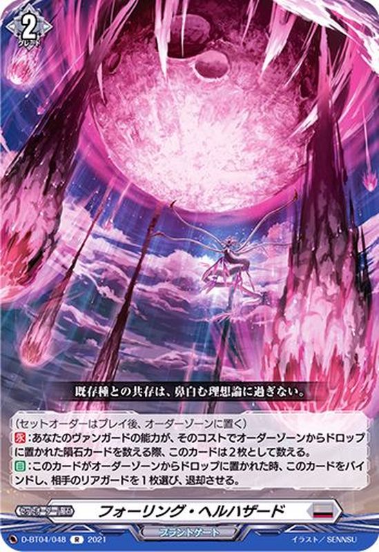 (セットオーダーはプレイ後、オーダーゾーンに置く)【永】:あなたのヴァンガードの能力が、そのコストでオーダーゾーンからドロップに置かれた隕石カードを数える際、このカードは2枚として数える。【自】:このカードがオーダーゾーンからドロップに置かれた時、このカードをバインドし、相手のリアガードを1枚選び、退却させる。