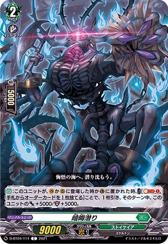 【自】:このユニットが、(V)か(R)に登場した時か(G)に置かれた時、【コスト】[【ソウルブラスト】(1),手札からオーダーカードを1枚捨てる]ことで、1枚引き、そのターン中、このユニットのパワー+5000/シールド+5000。