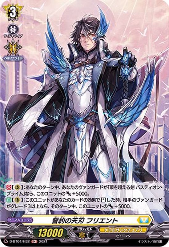 【永】【(R)】:あなたのターン中、あなたのヴァンガードが「頂を超える剣 バスティオン・プライム」なら、このユニットのパワー+5000。【自】【(R)】:このユニットがあなたのカードの効果で【スタンド】した時、相手のヴァンガードがグレード3以上なら、そのターン中、このユニットのパワー+5000。