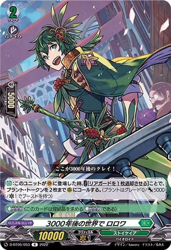 【自】:このユニットが(V)に登場した時、【コスト】[リアガードを1枚退却させる]ことで、プラント・トークンを2枚まで(R)にコールする。(プラントはグレード0/パワー5000/クリティカル1でブーストを持つ)【煌求者】(このカードは煌結晶を求める【煌求者】である)