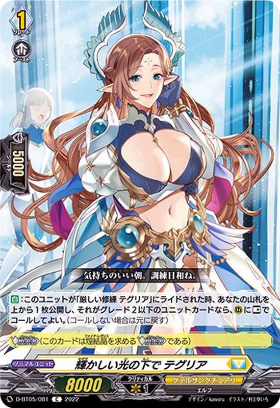 【自】:このユニットが「厳しい修練 テグリア」にライドされた時、あなたの山札を上から1枚公開し、それがグレード2以下のユニットカードなら、(R)に【レスト】でコールしてよい。(コールしない場合は元に戻す)【煌求者】(このカードは煌結晶を求める【煌求者】である)