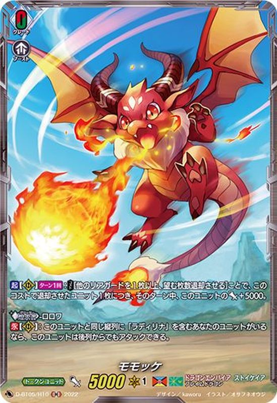 【起】【(R)】【ターン1回】:【コスト】[他のリアガードを1枚以上、望む枚数退却させる]ことで、このコストで退却させたユニット1枚につき、そのターン中、このユニットのパワー+5000。【煌求者】-ロロワ【永】【(R)】:このユニットと同じ縦列に「ラディリナ」を含むあなたのユニットがいるなら、このユニットは後列からでもアタックできる。