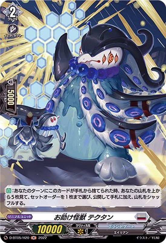 【自】:あなたのターンにこのカードが手札から捨てられた時、あなたの山札を上から5枚見て、セットオーダーを1枚まで選び、公開して手札に加え、山札をシャッフルする。