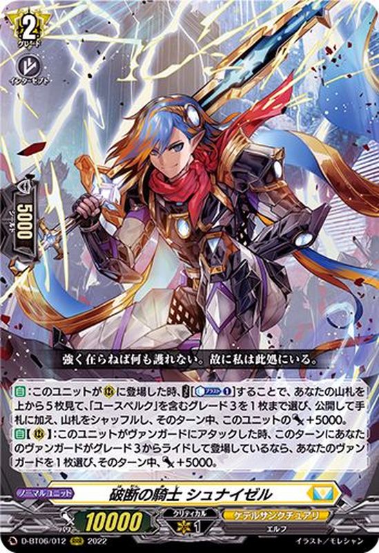 【自】:このユニットが(R)に登場した時、【コスト】[【カウンターブラスト】(1)]することで、あなたの山札を上から5枚見て、「ユースベルク」を含むグレード3を1枚まで選び、公開して手札に加え、山札をシャッフルし、そのターン中、このユニットのパワー+5000。【自】【(R)】:このユニットがヴァンガードにアタックした時、このターンにあなたのヴァンガードがグレード3からライドして登場しているなら、あなたのヴァンガードを1枚選び、そのターン中、パワー+5000。