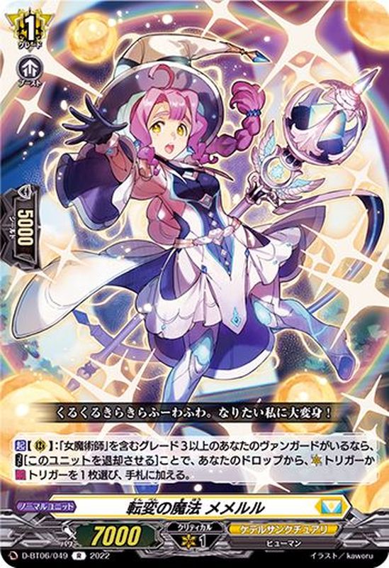 【起】【(R)】:「女魔術師」を含むグレード3以上のあなたのヴァンガードがいるなら、【コスト】[このユニットを退却させる]ことで、あなたのドロップから、【クリティカル】トリガーか【前】トリガーを1枚選び、手札に加える。