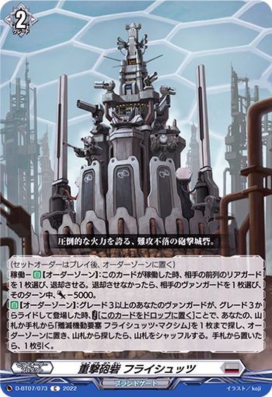 (セットオーダーはプレイ後、オーダーゾーンに置く)稼働-【自】【オーダーゾーン】:このカードが稼働した時、相手の前列のリアガードを1枚選び、退却させる。退却させなかったら、相手のヴァンガードを1枚選び、そのターン中、パワー-5000。【自】【オーダーゾーン】:グレード3以上のあなたのヴァンガードが、グレード3からライドして登場した時、【コスト】[このカードをドロップに置く]ことで、あなたの、山札か手札から「殲滅機動要塞 フライシュッツ・マクシム」を1枚まで探し、オーダーゾーンに置き、山札から探したら、山札をシャッフルする。手札から置いたら、1枚引く。