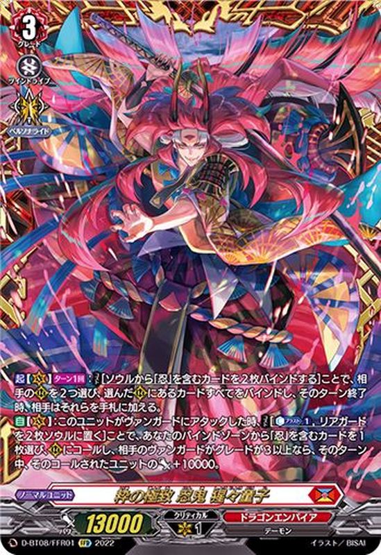 【起】【(V)】【ターン1回】:【コスト】[ソウルから「忍」を含むカードを2枚バインドする]ことで、相手の(R)を2つ選び、選んだ(R)にあるカードすべてをバインドし、そのターン終了時、相手はそれらを手札に加える。【自】【(V)】:このユニットがヴァンガードにアタックした時、【コスト】[【カウンターブラスト】(1),リアガードを2枚ソウルに置く]ことで、あなたのバインドゾーンから「忍」を含むカードを1枚選び、(R)にコールし、相手のヴァンガードがグレードが3以上なら、そのターン中、そのコールされたユニットのパワー+10000。