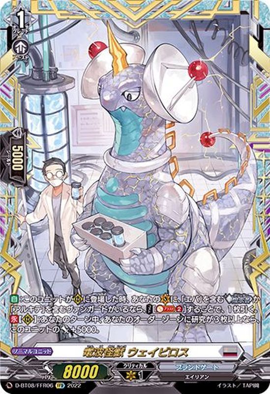 【自】:このユニットが(R)に登場した時、あなたの(V)に、「エバ」を含む【煌求者】か「アルキテ」を含むヴァンガードがいるなら、【コスト】[【ソウルブラスト】(2)]することで、1枚引く。【永】【(R)】:あなたのターン中、あなたのオーダーゾーンに研究が3枚以上なら、このユニットのパワー+5000。