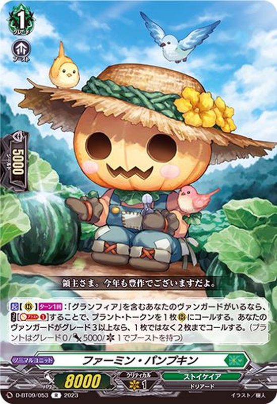 【起】【(R)】【ターン1回】:「グランフィア」を含むあなたのヴァンガードがいるなら、【コスト】[【ソウルブラスト】(1)]することで、プラント・トークンを1枚(R)にコールする。あなたのヴァンガードがグレード3以上なら、1枚ではなく2枚までコールする。(プラントはグレード0/パワー5000/クリティカル1でブーストを持つ)