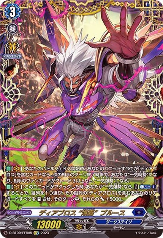 【自】【(V)】:あなたのバトルフェイズ開始時、あなたのユニットすべてが「ディアブロス」を含むカードなら、次の相手のターン終了時まで、あなたは“一気呵勢”になり、相手のヴァンガードがグレード3以上なら、“一気爆勢”になる。【自】【(V)】:このユニットがアタックした時、あなたが“一気爆勢”なら、【コスト】[【カウンターブラスト】(1)]することで、縦列を1つ選び、その縦列の「ディアブロス」を含むあなたのリアガードすべてを【スタンド】させ、そのターン中、それらのパワー+5000。