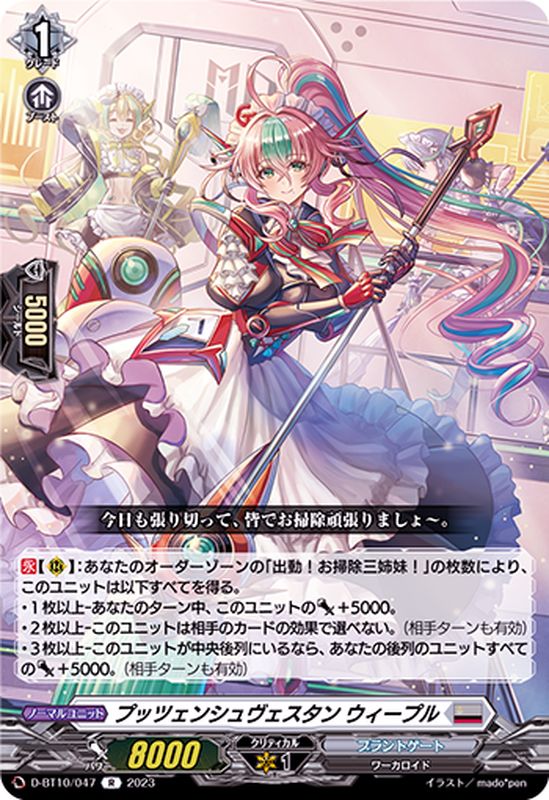 【永】【(R)】:あなたのオーダーゾーンの「出動!お掃除三姉妹!」の枚数により、このユニットは以下すべてを得る。・1枚以上-あなたのターン中、このユニットのパワー+5000。・2枚以上-このユニットは相手のカードの効果で選べない。(相手ターンも有効)・3枚以上-このユニットが中央後列にいるなら、あなたの後列のユニットすべてのパワー+5000。(相手ターンも有効)