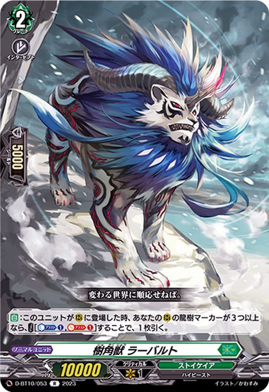 【自】:このユニットが(R)に登場した時、あなたの(R)の龍樹マーカーが3つ以上なら、【コスト】[【カウンターブラスト】(1),【ソウルブラスト】(1)]することで、1枚引く。
