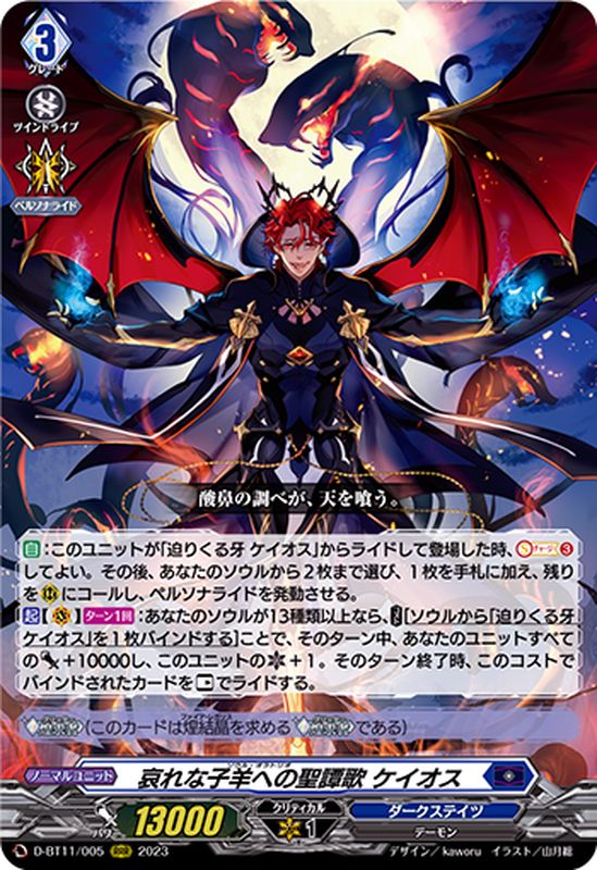 【自】:このユニットが「迫りくる牙 ケイオス」からライドして登場した時、【ソウルチャージ】(3)してよい。その後、あなたのソウルから2枚まで選び、1枚を手札に加え、残りを(R)にコールし、ペルソナライドを発動させる。【起】【(V)】【ターン1回】:あなたのソウルが13種類以上なら、【コスト】[ソウルから「迫りくる牙 ケイオス」を1枚バインドする]ことで、そのターン中、あなたのユニットすべてのパワー+10000し、このユニットのクリティカル+1。そのターン終了時、このコストでバインドされたカードを【レスト】でライドする。 【煌求者】(このカードは煌結晶を求める【煌求者】である)