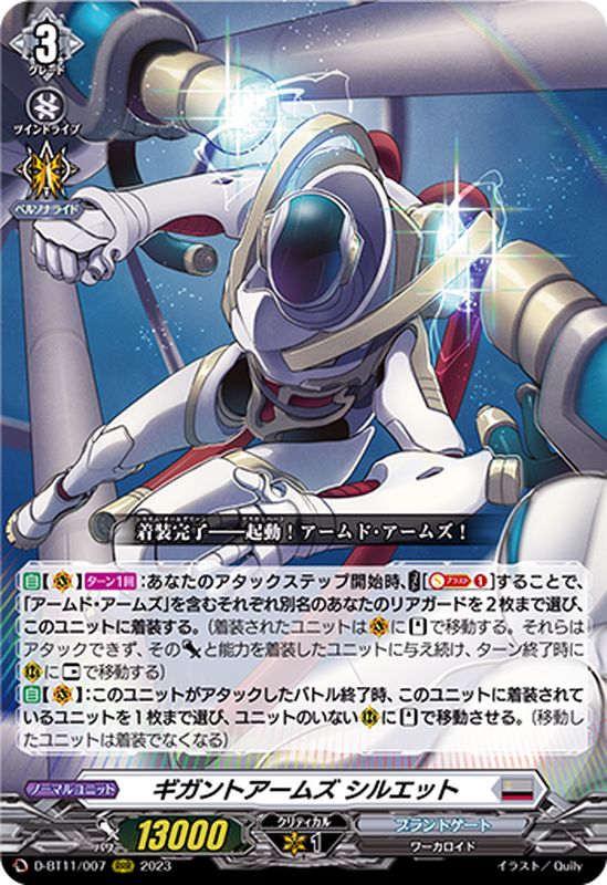 【自】【(V)】【ターン1回】:あなたのアタックステップ開始時、【コスト】[【ソウルブラスト】(1)]することで、「アームド・アームズ」を含むそれぞれ別名のあなたのリアガードを2枚まで選び、このユニットに着装する。(着装されたユニットは(V)に【スタンド】で移動する。それらはアタックできず、そのパワーと能力を着装したユニットに与え続け、ターン終了時に(R)に【レスト】で移動する)【自】【(V)】:このユニットがアタックしたバトル終了時、このユニットに着装されているユニットを1枚まで選び、ユニットのいない(R)に【スタンド】で移動させる。(移動したユニットは着装でなくなる)