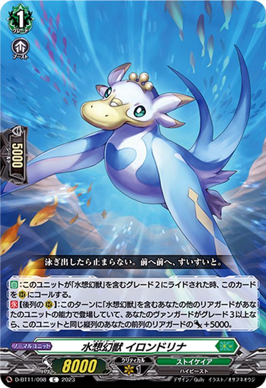 【自】:このユニットが「水想幻獣」を含むグレード2にライドされた時、このカードを(R)にコールする。【永】【後列の(R)】:このターンに「水想幻獣」を含むあなたの他のリアガードがあなたのユニットの能力で登場していて、あなたのヴァンガードがグレード3以上なら、このユニットと同じ縦列のあなたの前列のリアガードのパワー+5000。
