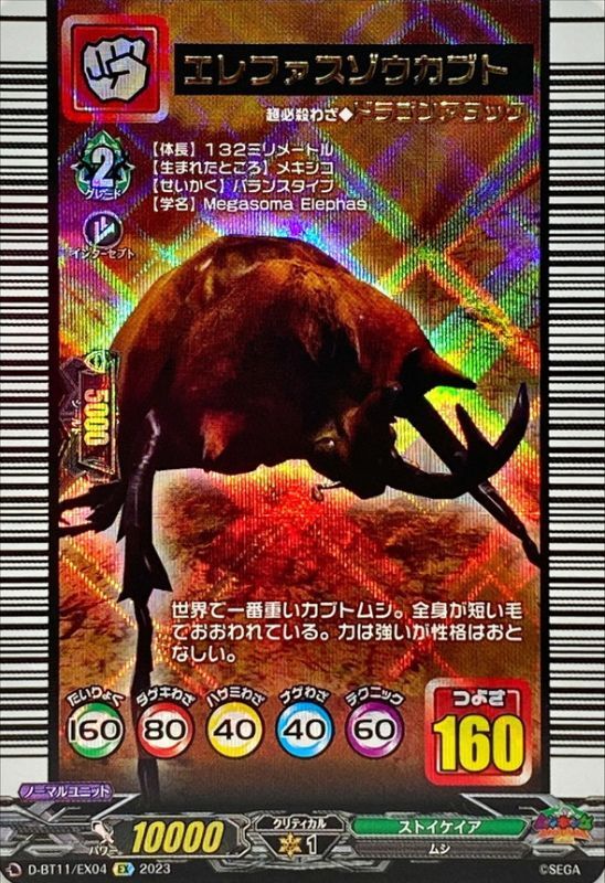必殺わざ:ダゲキ超必殺わざ:ドラゴンアタック【体長】132ミリメートル【生まれたところ】メキシコ【せいかく】バランスタイプ【学名】Megasoma Elephasたいりょく:160ダゲキわざ:80ハサミわざ:40ナゲわざ:40テクニック:60つよさ:160