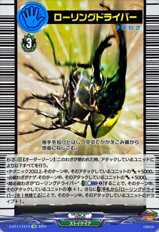 わざ-【自】【オーダーゾーン】:このわざが使われた時、アタックしているユニットにより以下すべてを行う。・テクニック20以上-そのターン中、そのアタックしているユニットのパワー+5000。・必殺わざがナゲ-そのターン中、そのアタックしているユニットのパワー+5000。・超必殺わざが“ローリングドライバー”-【コスト】[【カウンターブラスト】(1)]することで、そのターン中、そのアタックしているユニットのクリティカル+1。さらに【コスト】[手札から「ローリングドライバー」を1枚捨てる]ことで、そのターン中、そのアタックしているユニットのドライブ+1。