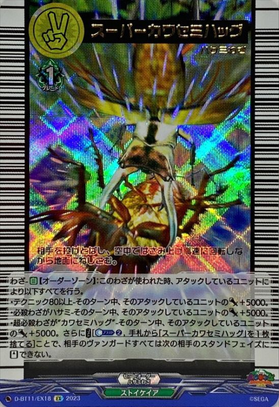 わざ-【自】【オーダーゾーン】:このわざが使われた時、アタックしているユニットにより以下すべてを行う。・テクニック80以上-そのターン中、そのアタックしているユニットのパワー+5000。・必殺わざがハサミ-そのターン中、そのアタックしているユニットのパワー+5000。・超必殺わざが“カワセミハッグ”-そのターン中、そのアタックしているユニットのパワー+5000。さらに【コスト】[【カウンターブラスト】(2),手札から「スーパーカワセミハッグ」を1枚捨てる]ことで、相手のヴァンガードすべては次の相手のスタンドフェイズに【スタンド】できない。