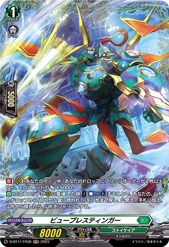 【永】【(R)】:あなたのターン中、あなたのドロップにブリッツオーダーが2枚以上なら、このユニットのパワー+5000。【自】:このユニットが(R)に登場した時、【コスト】[【カウンターブラスト】(1)]することで、あなたの、山札かドロップから「甘やかな蜜に誘われて」を1枚まで探し、公開して手札に加え、山札から探したら、山札をシャッフルする。