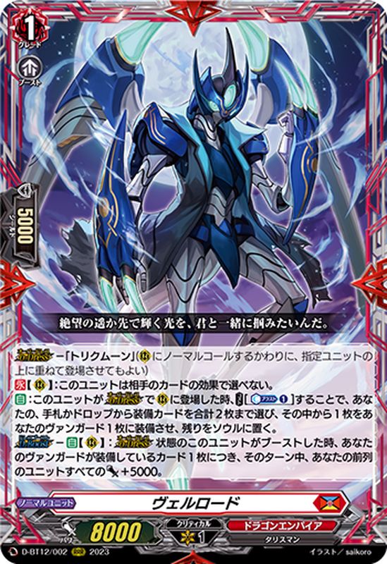 【オーバードレス】-「トリクムーン」((R)にノーマルコールするかわりに、指定ユニットの上に重ねて登場させてもよい)【永】【(R)】:このユニットは相手のカードの効果で選べない。【自】:このユニットが【オーバードレス】で(R)に登場した時、【コスト】[【カウンターブラスト】(1)]することで、あなたの、手札かドロップから装備カードを合計2枚まで選び、その中から1枚をあなたのヴァンガード1枚に装備させ、残りをソウルに置く。【ドレスブースト】-【自】【(R)】:【オーバードレス】状態のこのユニットがブーストした時、あなたのヴァンガードが装備しているカード1枚につき、そのターン中、あなたの前列のユニットすべてのパワー+5000。