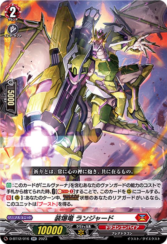 【自】:このカードが「ニルヴァーナ」を含むあなたのヴァンガードの能力のコストで手札から捨てられた時、【コスト】[【ソウルブラスト】(1)]することで、このカードを(R)にコールする。【永】【(R)】:あなたのターン中、【クロスオーバードレス】状態のあなたのリアガードがいるなら、このユニットは『ブースト』を得る。