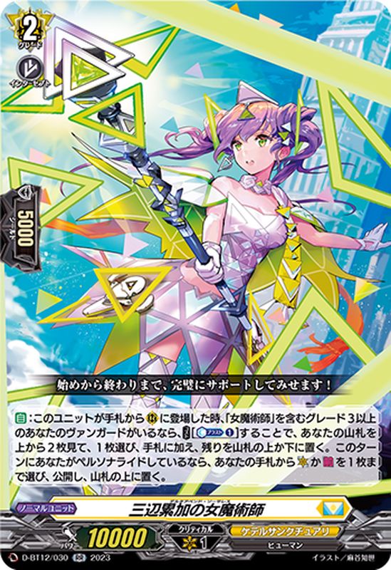 【自】:このユニットが手札から(R)に登場した時、「女魔術師」を含むグレード3以上のあなたのヴァンガードがいるなら、【コスト】[【カウンターブラスト】(1)]することで、あなたの山札を上から2枚見て、1枚選び、手札に加え、残りを山札の上か下に置く。このターンにあなたがペルソナライドしているなら、あなたの手札から【クリティカル】か【前】を1枚まで選び、公開し、山札の上に置く。