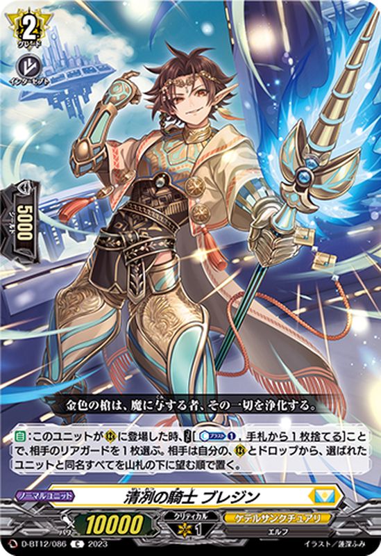 【自】:このユニットが(R)に登場した時、【コスト】[【カウンターブラスト】(1),手札から1枚捨てる]ことで、相手のリアガードを1枚選ぶ。相手は自分の、(R)とドロップから、選ばれたユニットと同名すべてを山札の下に望む順で置く。