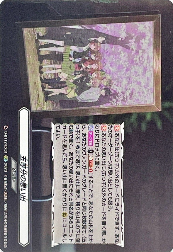 【永】:あなたは〈五つ子〉以外のカードにライドできず、あなたのオーダーゾーンは思い出としても扱う。【永】:あなたの思い出に〈五つ子〉以外のカードを置く際、かわりにドロップに置く。【起】【ターン1回】:【コスト】[【ソウルブラスト】(1)]することで、あなたの山札を上から、あなたのヴァンガードのグレードと同じ枚数見て、〈五つ子〉を1枚まで選び、思い出に置き、残りを山札の下に望む順で置く。あなたの思い出にそれと同名があるユニットカードを選んだら、思い出に置くかわりに(R)にコールしてよい。