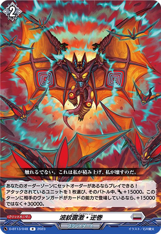 あなたのオーダーゾーンにセットオーダーがあるならプレイできる!アタックされているユニットを1枚選び、そのバトル中、パワー+15000。このターンに相手のヴァンガードがカードの能力で登場しているなら、+15000ではなく+30000。