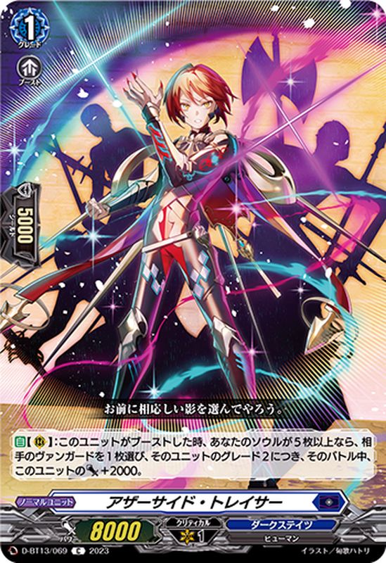 【自】【(R)】:このユニットがブーストした時、あなたのソウルが5枚以上なら、相手のヴァンガードを1枚選び、そのユニットのグレード2につき、そのバトル中、このユニットのパワー+2000。