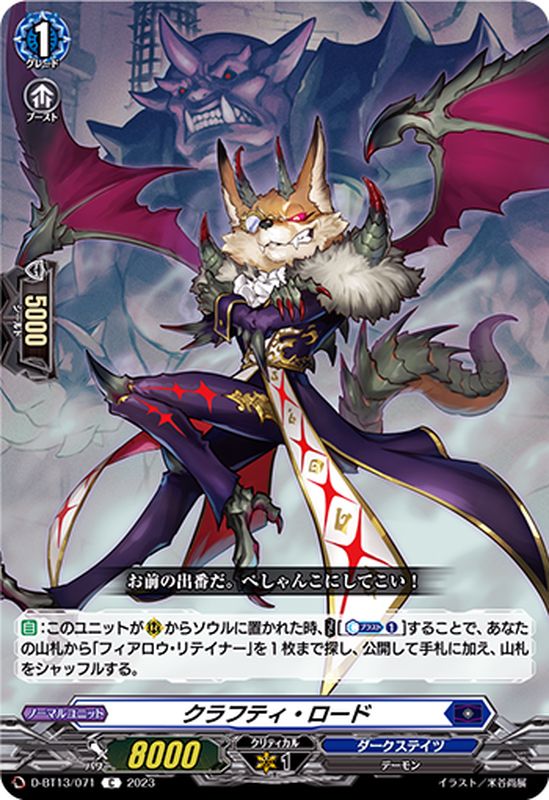 【自】:このユニットが(R)からソウルに置かれた時、【コスト】[【カウンターブラスト】(1)]することで、あなたの山札から「フィアロウ・リテイナー」を1枚まで探し、公開して手札に加え、山札をシャッフルする。