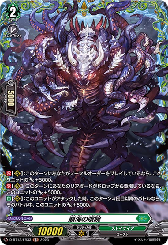 【永】【(R)】:このターンにあなたがノーマルオーダーをプレイしているなら、このユニットのパワー+5000。【永】【(R)】:このターンにあなたのリアガードがドロップから登場しているなら、このユニットのパワー+5000。【自】【(R)】:このユニットがアタックした時、このターン4回目以降のバトルなら、そのバトル中、このユニットのパワー+5000。