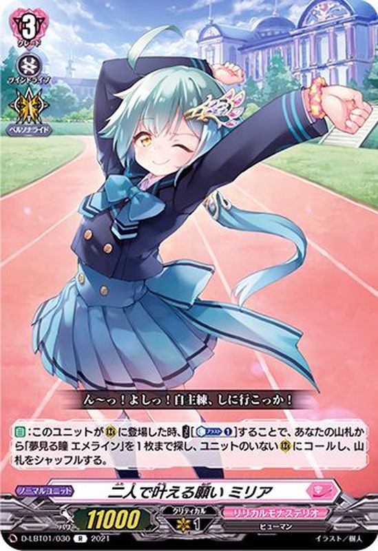 【自】:このユニットが(R)に登場した時、【コスト】[【カウンターブラスト】(1)]することで、あなたの山札から「夢見る瞳 エメライン」を1枚まで探し、ユニットのいない(R)にコールし、山札をシャッフルする。