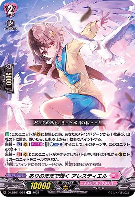 【自】:このユニットが(V)に登場した時、あなたのバインドゾーンから1枚選び、山札の下に置き、置いたら、山札を上から1枚表でバインドする。白翼-【起】【(V)】【ターン1回】:【コスト】[【カウンターブラスト】(1)]することで、そのターン中、このユニットのクリティカル+1。黒翼-【永】【(V)】:このユニットがアタックしたバトル中、相手は手札から(G)にトリガーユニットをコールできない。(白翼はバインドに奇数グレードのみ、黒翼は偶数のみで有効)