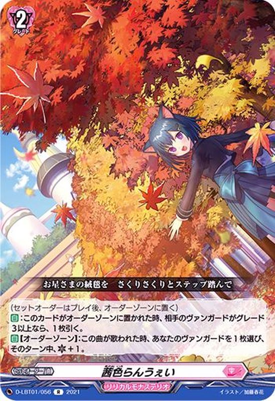 (セットオーダーはプレイ後、オーダーゾーンに置く)【自】:このカードがオーダーゾーンに置かれた時、相手のヴァンガードがグレード3以上なら、1枚引く。【自】【オーダーゾーン】:この曲が歌われた時、あなたのヴァンガードを1枚選び、そのターン中、クリティカル+1。