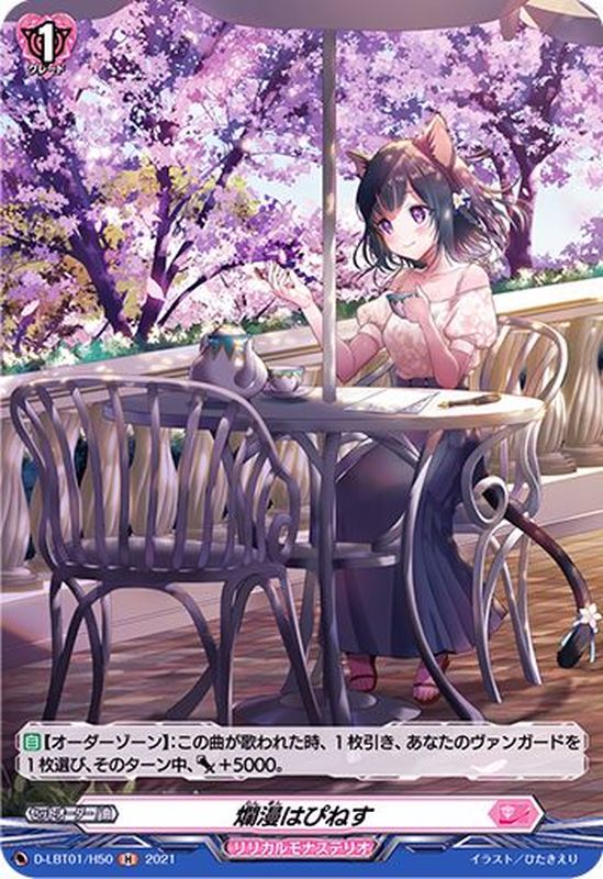 【自】【オーダーゾーン】:この曲が歌われた時、1枚引き、あなたのヴァンガードを1枚選び、そのターン中、パワー+5000。