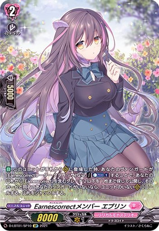 【自】:このユニットが手札から(R)に登場した時、あなたのヴァンガードが「Earnescorrectリーダー クラリッサ」なら、【コスト】[【カウンターブラスト】(1)]することで、あなたの山札から「Earnescorrect」を含むグレード2以下を1枚まで探して公開し、そのカードと同名のあなたのリアガードがいないなら、ユニットのいない(R)にコールする。山札をシャッフルする。