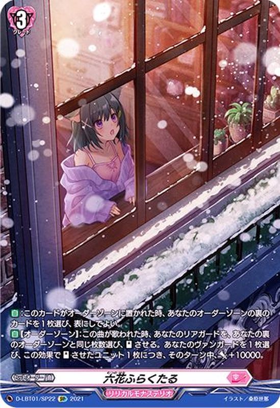 【自】:このカードがオーダーゾーンに置かれた時、あなたのオーダーゾーンの裏のカードを1枚選び、表にしてよい。【自】【オーダーゾーン】:この曲が歌われた時、あなたのリアガードを、あなたの裏のオーダーゾーンと同じ枚数選び、【スタンド】させる。あなたのヴァンガードを1枚選び、この効果で【スタンド】させたユニット1枚につき、そのターン中、パワー+10000。