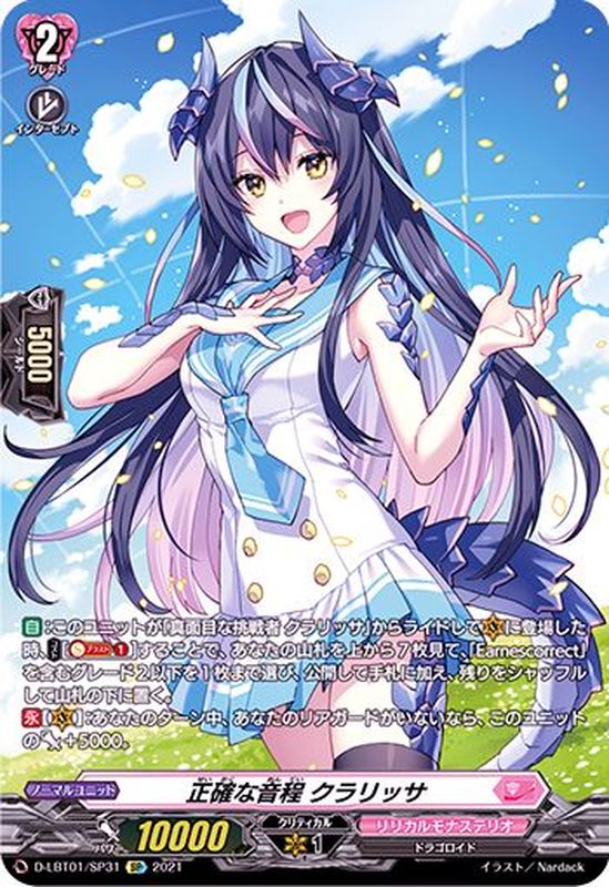 【自】:このユニットが「真面目な挑戦者 クラリッサ」からライドして(V)に登場した時、【コスト】[【ソウルブラスト】(1)]することで、あなたの山札を上から7枚見て、「Earnescorrect」を含むグレード2以下を1枚まで選び、公開して手札に加え、残りをシャッフルして山札の下に置く。【永】【(V)】:あなたのターン中、あなたのリアガードがいないなら、このユニットのパワー+5000。