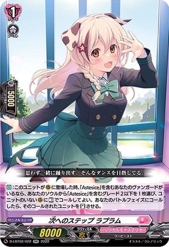 【自】:このユニットが(R)に登場した時、「Astesice」を含むあなたのヴァンガードがいるなら、あなたのソウルから「Astesice」を含むグレード2以下を1枚選び、ユニットのいない(R)に【レスト】でコールしてよい。あなたのバトルフェイズにコールしたら、そのコールされたユニットを【スタンド】させる。