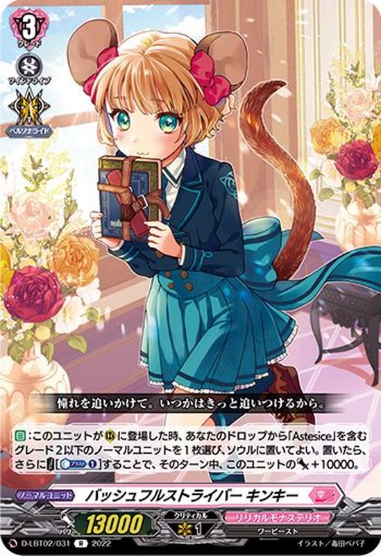 【自】:このユニットが(R)に登場した時、あなたのドロップから「Astesice」を含むグレード2以下のノーマルユニットを1枚選び、ソウルに置いてよい。置いたら、さらに【コスト】[【カウンターブラスト】(1)]することで、そのターン中、このユニットのパワー+10000。