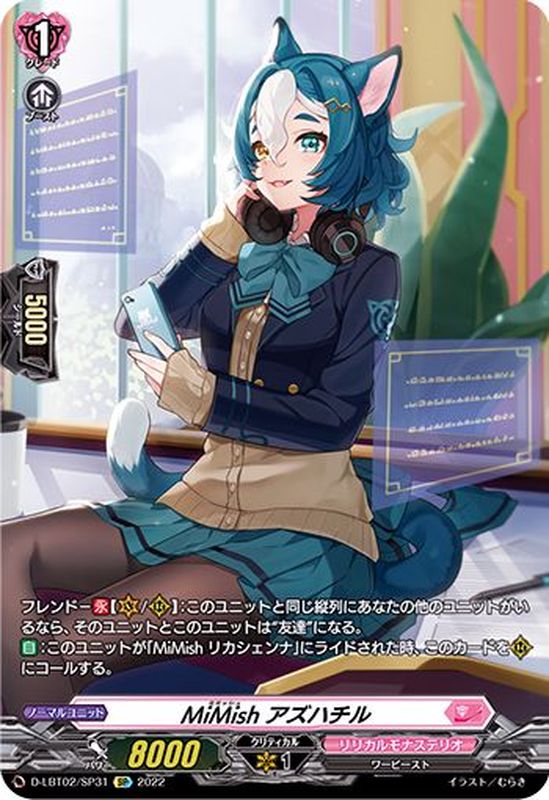 フレンド-【永】【(V)/(R)】:このユニットと同じ縦列にあなたの他のユニットがいるなら、そのユニットとこのユニットは“友達”になる。【自】:このユニットが「MiMish リカシェンナ」にライドされた時、このカードを(R)にコールする。